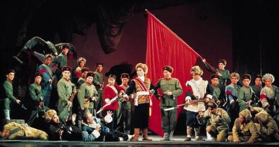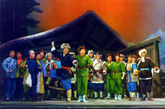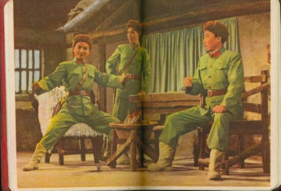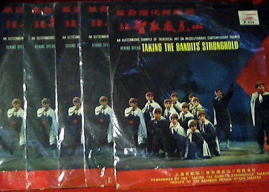 “样板”和“样板戏”之称,最初分别见于1965年3月16日,上海《解放日报》刊登的署名“本报评论员”者赞扬京剧《红灯记》的文章,以及1966年10月24日,《人民日报》刊登的两位上海工人赞扬京剧《智取威虎山》的文章。图为《智取威虎山》剧照。
