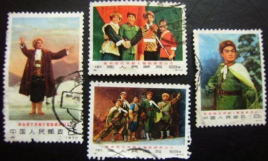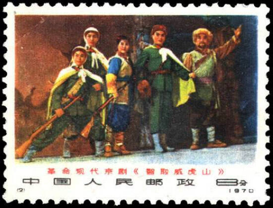 1964年5月20日《人民日报》报道,上海京剧院最近重新上演大型现代剧《智取威虎山》。广大观众和文艺界人士赞扬这个戏是上海京剧界推陈出新的可喜成果之一……大家认为,《智取威虎山》在运用京戏传统程式和发展、创造新程式方面也取得了很好的成果。图为以《智取威虎山》为主题的邮票。