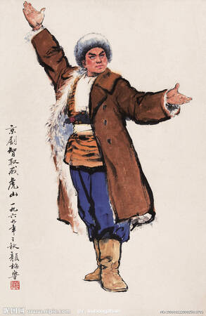 1964年7月6日,《人民日报》发表了李希凡的文章《努力创造革命战士的英雄形象:评京剧《智取威虎山》取得的成就》,文章认为,剧中正面人物少剑波、杨子荣的形象加强了,反面人物的嚣张气焰被压缩了;过分偶然性的传奇色彩有所削弱,而小分队的集体英雄主义以及人民的支援,都得到了有力的表现。图为表现杨子荣英雄气概的国画。