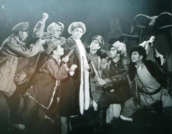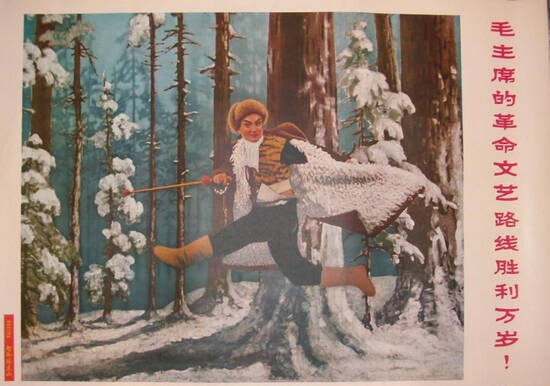 江青评价说,对《智取威虎山》,上海从第一书记起,亲自修改。是否比过去改坏了,我看是改好了。只举一个例子,定河老道砍了场戏,座山雕只减了几句话,但由于杨子荣的形象高大了,他就黯然失色了。所以上海团不用紧张,如果一个戏竟然几句话批倒了,还算什么戏剧艺术?问题在于屁股坐在正面人物方面抑或坐在反面人物方面。图为相关宣传画。