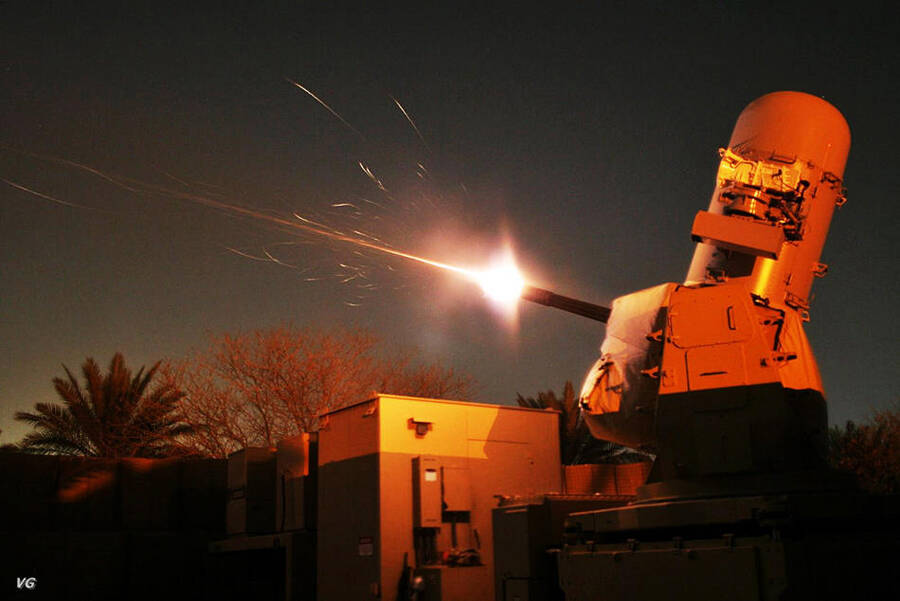 由于美军在伊拉克驻防期间,基地时常遭到反美武装的迫击炮弹和火箭弹袭击,造成人员伤亡和装备损失。因此美国雷神公司专门研发了可拦截迫击炮弹和火箭弹的“陆基密集阵武器系统”。陆基密集阵武器系统采用奥什科什公司的M977战术卡车底盘,集成了采用闭合定位技术的先进搜索和跟踪雷达。在作战状态下,一旦锁定目标,其20毫米口径M61A1型“加特林”速射机关炮可在1分钟内发射4500枚炮弹形成“弹幕”拦截目标。其夜间射击场面壮观,而且十分罕见。