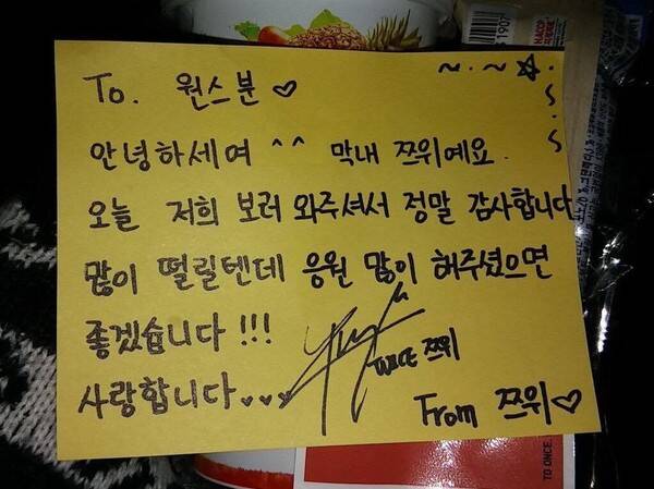 信中写到:“ONCE们,大家好,我是子瑜,真的很感谢今天特地来到这边看我们的大家!因为我真的很紧张,所以如果能够多多为我们应援就好了!爱你们”,TWICE的粉丝拿到亲笔信后,立刻上传推特,让不少网友超羡慕,也赞子瑜是“暖女”。图为周子瑜现身节目录像,亲手写下给粉丝的纸条。