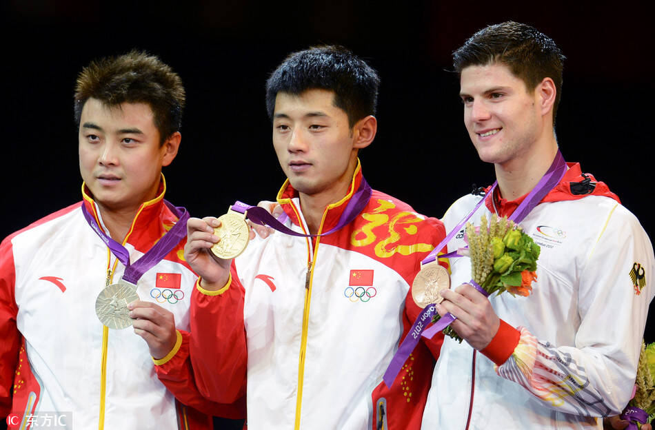 当地时间2012年8月2日,英国伦敦,2012年伦敦奥运会上,中国选手张继科(中)、王皓(左)摘获乒乓球男单金银牌。
