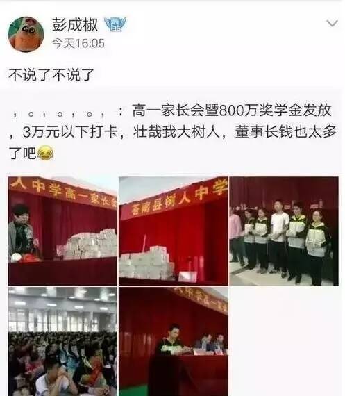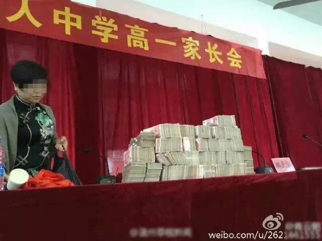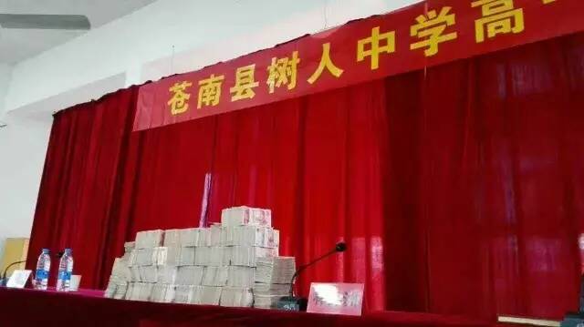 昨天,有网友在微博上爆料称:11月20日,在苍南县树人中学的高一家长会现场,主席台桌子上摆放了堆成一座小山的百元大钞,是发放给中考成绩优异的奖学金获得者,奖学金标准是以学生中考成绩划分的。 苍南县树人中学董事长和校长作出回应,为了招到更好的学生,鼓励学生努力学习,确实对于今年刚入学的高一新生发放了800多万元的奖学金。