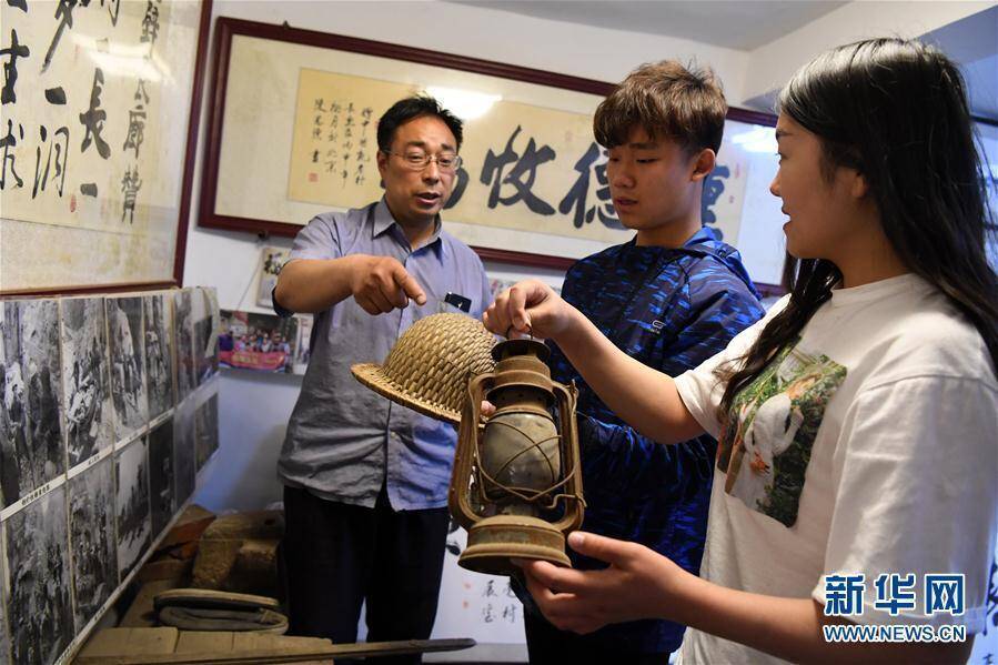 月18日,郭亮村村民申清民(左)在家中向游客讲述当年绝壁公路建设的故事。新华社记者 朱祥 摄