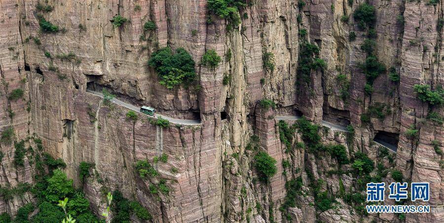 一辆汽车行驶在河南省辉县市郭亮村的绝壁公路上(5月17日摄)。新华社记者 张凤国 摄