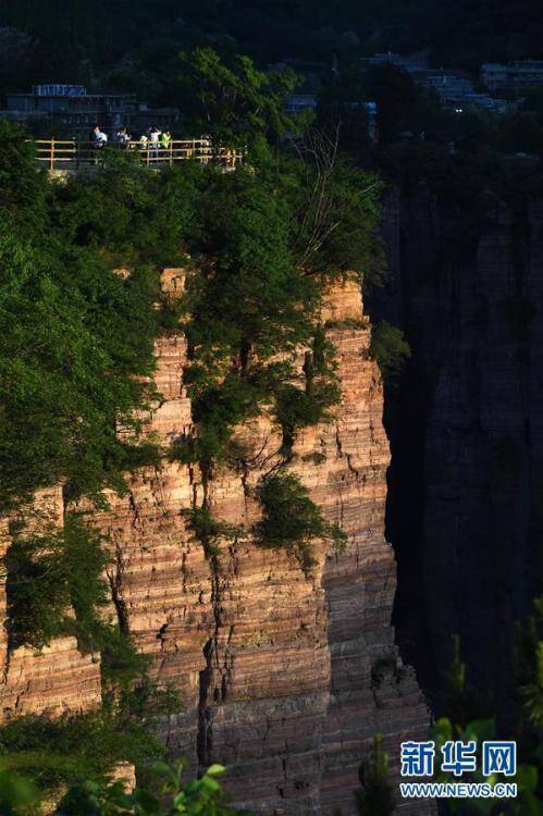 游客在河南省辉县市郭亮村观景平台上参观红岩绝壁大峡谷,这也是万仙山地质公园的一部分(5月17日摄)。新华社记者 李博 摄