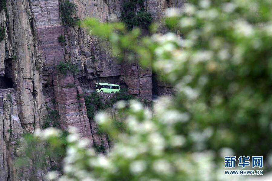 一辆旅游客车在河南省辉县市郭亮村的绝壁公路上行驶(5月17日摄)。新华社记者 李博 摄