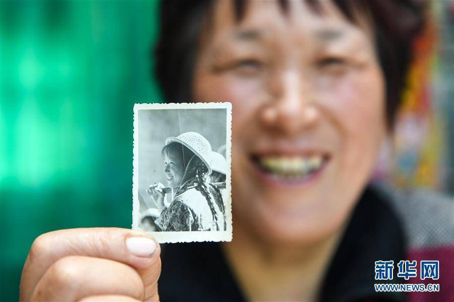 在河南省辉县市郭亮村,当地村民申香瑞展示当年在绝壁公路上劳动的照片。1975年,20岁的申香瑞和郭亮村村民一起奋斗在修路一线(5月17日摄)。新华社记者 李博 摄