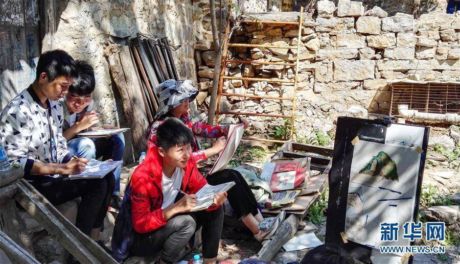 学生在河南省辉县市郭亮村内写生(5月17日摄)。新华社记者 张凤国 摄