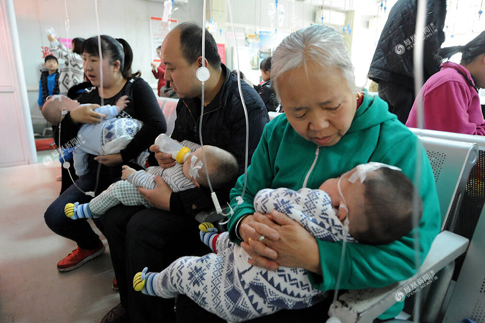 2014年11月4日,山西太原集中供暖的第四天,因天气降温屋内屋外一冷一热等因素影响,太原市迎来了儿童感冒高峰期。图为一家三胞胎感冒齐输液。摄影:马俊明