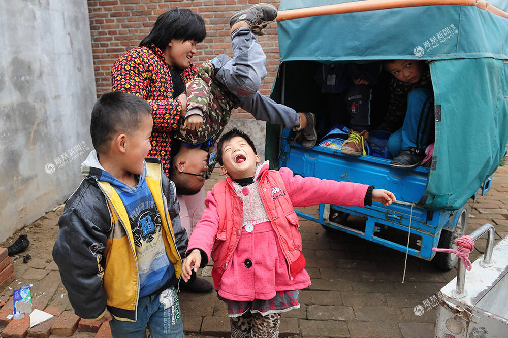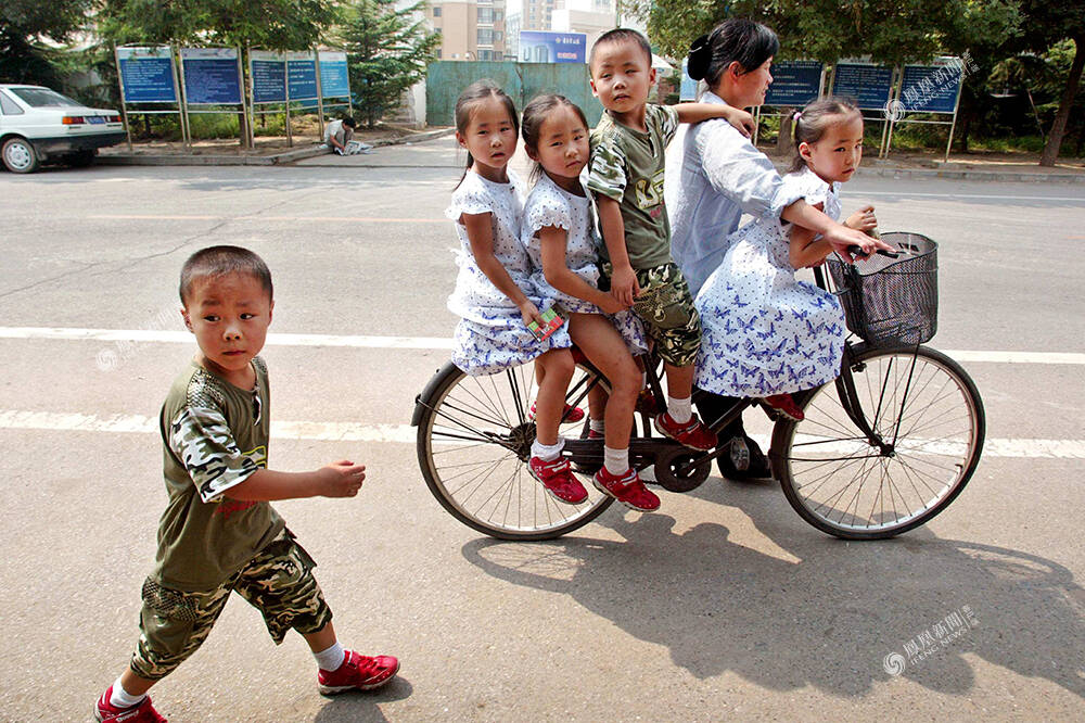 2008年2月18日,王翠英每次推车送五胞胎孩子们上幼儿园都像耍杂技,四人叠车上,而善于跑步的老二福森只好受委屈,走路约两公里。摄影:胡铁湘