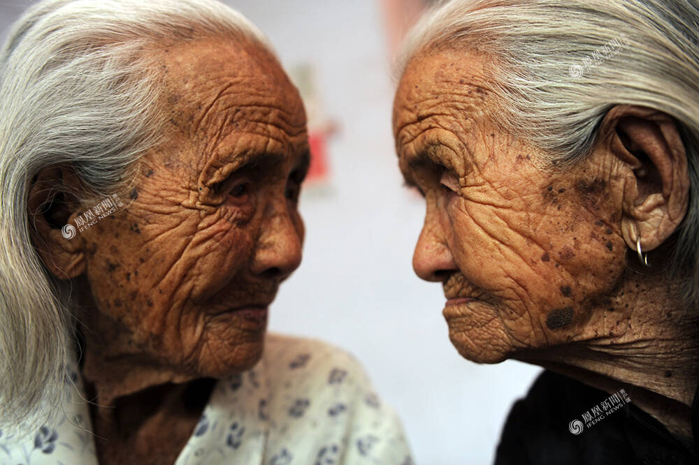 2008年11月,大乔和小乔被吉尼斯世界纪录认定为世界上年龄最大的双胞胎姐妹。姐姐曹大乔居住在刘家官庄村,生育了三个儿子一个女儿,其中有一对双胞胎。妹妹曹小乔则嫁到了范家岭村,生育了三个儿子三个女儿,其中有两对双胞胎。摄影:王志德