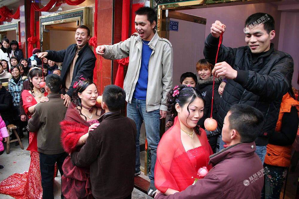 2006年1月17日,三胞胎新郎和新娘在婚庆典礼上做“同吃一个苹果”的游戏。当天,浙江省温岭市石塘镇粗沙头渔村三胞胎兄弟刘喜、刘兴、刘平,分别与王青青、吴雪琴、庄慧三位渔家女同时举行婚礼,亲朋好友云集纷纷为他们祝福。摄影:周学军