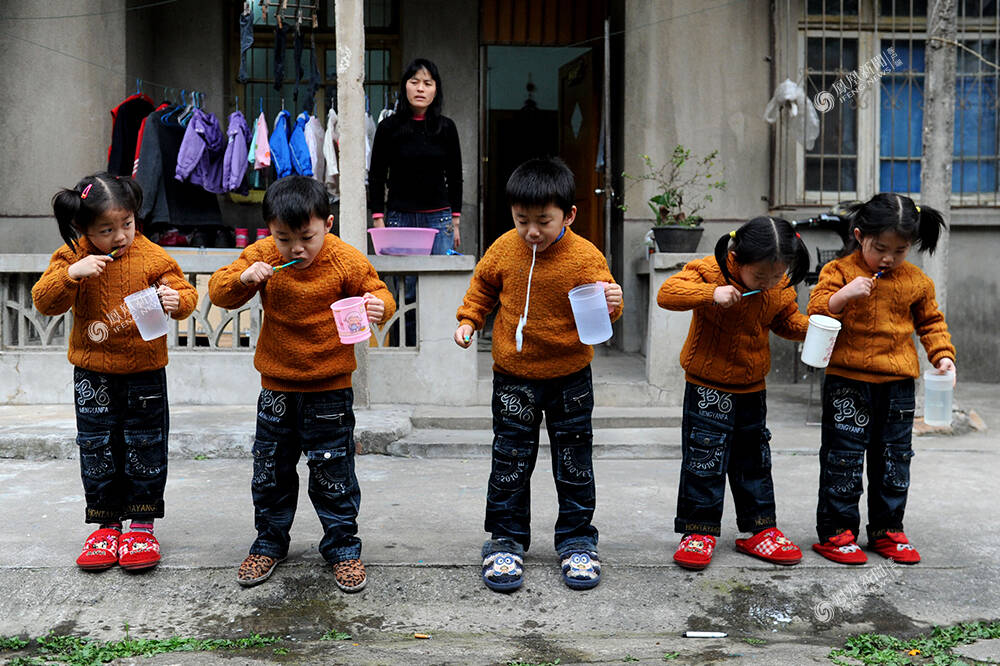 一个家庭要养活多胞胎不是容易的事情,这不止对于贫困家庭。图为2011年12月6日,家住安徽省太湖县的五胞胎正在刷牙。母亲史有琴于2006年在安庆市立医院剖腹产下三女两男“龙凤”五胞胎。2010年,五胞胎免费进入安庆市政府机关幼儿园。摄影:马启兵