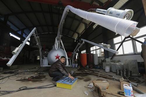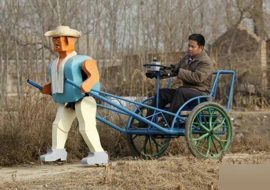 2009年1月8日,北京郊区,农民吴玉禄的行走机器人。发明家吴玉禄,自1986年来先后制作了47个不同功能的机器人,功能从跳跃到拉车不一而足。