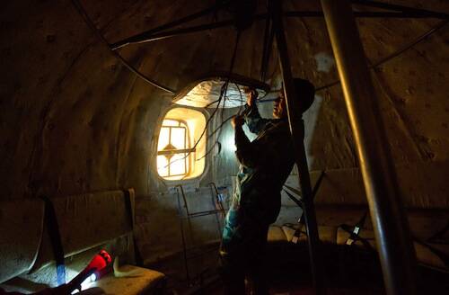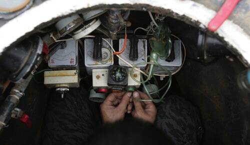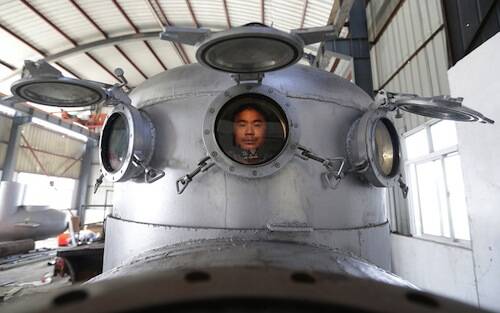 2012年11月14日,湖北武汉,张五一坐在他最新制造的多人潜水艇中。张五一是高中学历,曾是湖北省武汉一家纺织机械厂的工人,2008年下岗后的张五一对制造民用潜艇产生了兴趣,租借原来上班的厂房开始潜艇的研制。“潜艇工厂”有工人10来人,在2011年大连一商人以10万元的价格向张五一订购了一台潜水艇,潜水艇设计工况为海下20-30米并续航10小时。