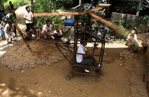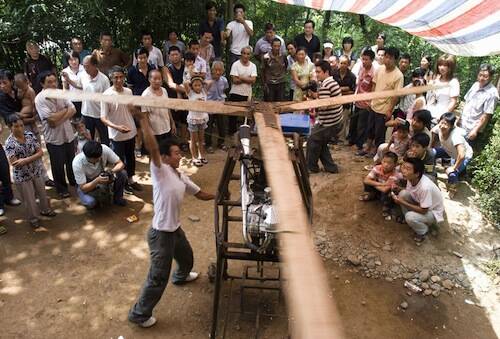 2009年8月1日,河南省旧县的22岁农民吴中原在展示和试飞用常见材料自制的直升机。他的这架直升机由150升的马达驱动,花了他两个月时间和1万元人民币。