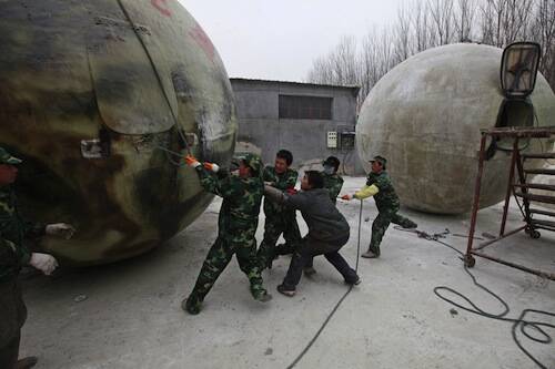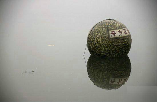 2012年12月12日,河北省香河县,工作人员们正在调整“诺亚方舟”的位置。
