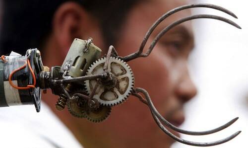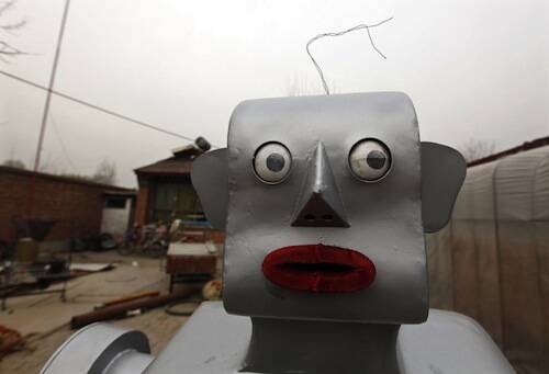 2003年9月3日在北京郊区,中国农民吴玉禄正坐在他设计的机器人“老吴”旁边。吴玉禄只有小学文化程度,十几年前,就开始痴迷于机器人设计,先后做了26个机器人。 这些机器人还被邀请到上海参加了世博会。现如今老吴修成正果。成立了一个机器人研究所,培养年轻人做机器人了。
