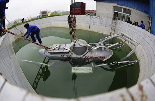 2013年3月25日,湖北武汉,张五一在他在调试他用来抓海参的潜水艇。