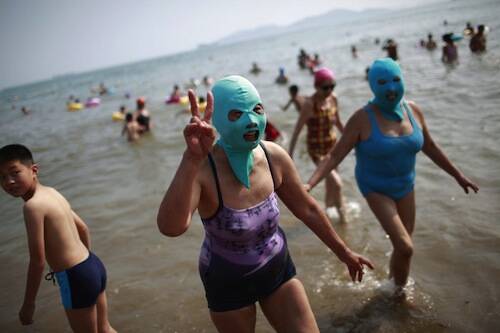 2012年7月6日,山东青岛海滩上,一名妇女头戴着尼龙面罩,该面罩是7年前由一位大姐发明的,用以防止紫外线灼伤皮肤。如今在青岛海滩上有售。