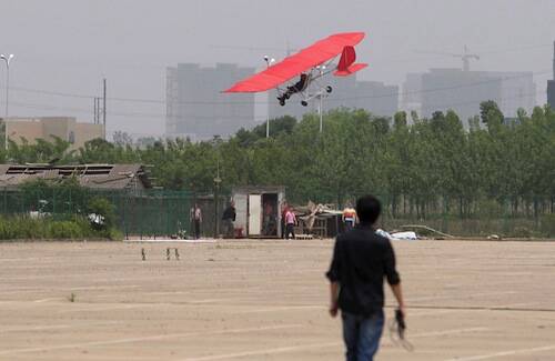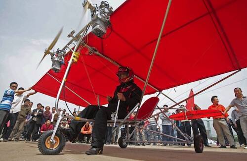 2012年5月10日,湖北武汉,农民舒满胜驾着自制的土飞机准备升空。