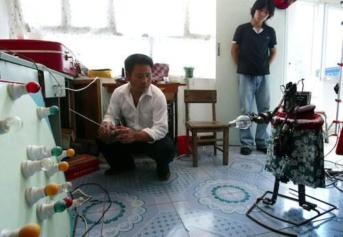 2003年9月3日,北京,吴玉禄和他的儿子在郊区的家中遥控他的机器人安装灯泡。