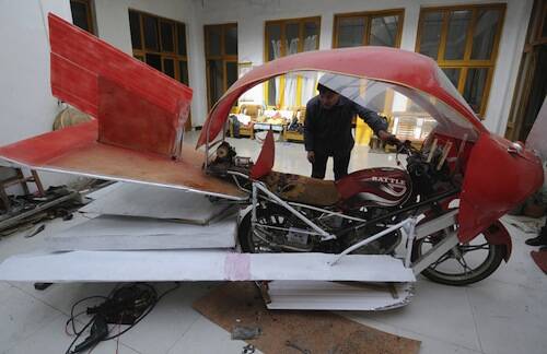 济南农民造飞机 这架由摩托车、PPC材料、三合板、木工板等材料组合成的“古怪”飞行物出自济南农民张学林之手,是张学林利用工作之余,历时近一年的时间打造而成的。