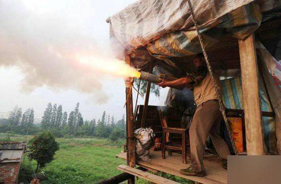 武汉农民自制大炮 2010年6月6日,中国农民杨有德在武汉郊区自己的田地附近点燃了自制的大炮。他的大炮由一辆独轮手推车、几根管子和火箭发射器组装而成。