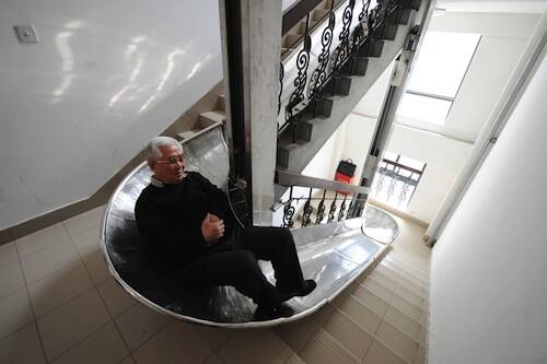 2013年3月21号,上海,70岁的周妙容在演示他的发明的逃生滑梯,2010年11月15日,上海静安区高层公寓发生火灾,导致58人遇难的事故,这件悲剧引发了周妙容发明这台的逃生电梯的念头,于是他花了将近两年的时间制作,滑梯平时收起,紧急情况时放下,逃生者倚躺在滑梯内,即可顺势滑到底楼。经周妙容测试,逃生时每层只需3秒至5秒,且可容纳多人同时滑行。
