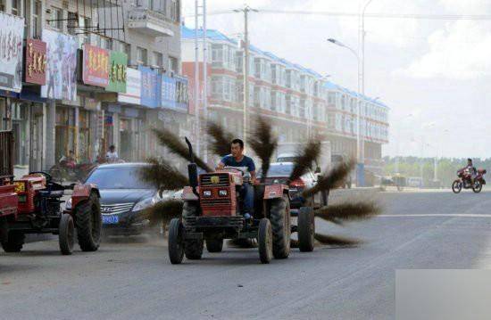 图中这个民间发明家在自己的拖拉机上改装上了12个大扫帚,这一设计使得该车可以在行驶的途中同时打扫街道。