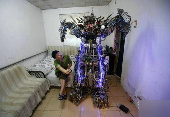 安徽农民打造“变形金刚” 该机器人身高2.1米、重480公斤,手脚可以进行简单的肢体动作,并能模拟人的发声。 但他目前也面临着一个头疼的问题,那就是由于这个机器人的尺寸太大,因此它已经没法正常走出自己的出租屋房门了。
