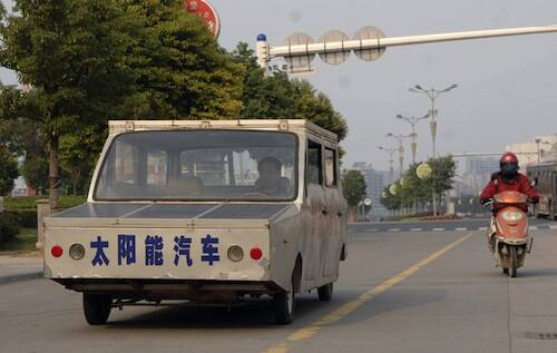 2008年2月24日,江苏靖江街头,一辆太阳能汽车亮相街头。这辆由6平方米太阳板和5组电瓶等材料造成太阳能汽车,是江苏省靖江市市民陈顺贵在其亲友帮助下投资13万元、花13个月用手工打造成的。这辆太阳能汽车外形尺寸长4460MM,宽1636MM,高1280MM,整车自重780KG,载客数5人,最大总重量(满载)1050KG,轴距2.8M,时速20-45KM/H,无极调速电控。
