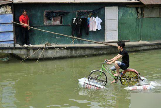 武汉小伙改造水上自行车 2010年6月16日,武汉小伙子雷志前用退休工程李卫国改装的这辆水陆两用自行车横渡了汉江。李卫国说,这辆车经过了3次改进。2008年第一次试制,用PVC管做浮筒,但因算错了浮力,“车到水里就沉了”。 后来,他花费2万多元作了改进,并让独生女儿和学生充当“试航员”,在东湖、长江里进行了试验。现在的车型已解决了转向不灵活、重心不稳以及车身过重等问题。他说:“这种车只要会骑自行车的都可以骑,而且成本低至600元,适合小城市居民做家用水上交通工具。”