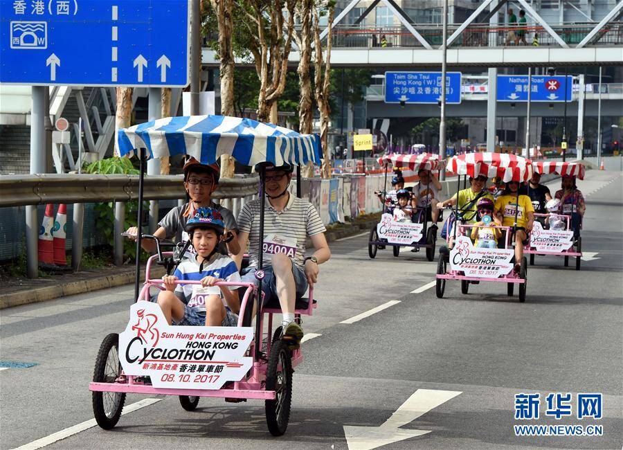 10月8日,参赛选手在家庭自行车赛中角逐。当日,香港自行车节在尖沙咀举行,其比赛有30和50公里公路赛、家庭自行车赛、青少年自行车赛、男女公路绕圈赛等。 新华社记者卢炳辉摄