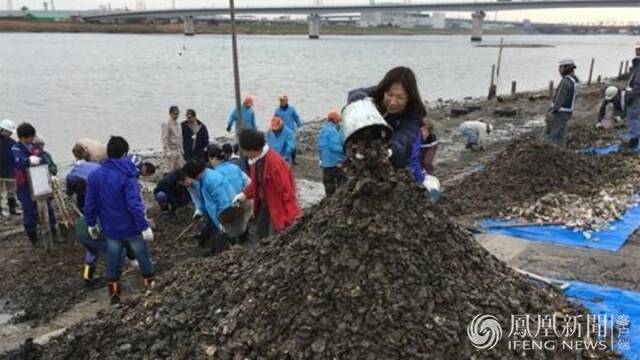 12月7日报道,流经日本千叶县市川市的江户川早在数年前开始有中国游客在河中采生蚝。报道称,游客把蚝肉挖走后便把蚝壳随处丢弃,高峰时有多达100吨的蚝壳弃于河边,导致当地不少儿童被割伤。12月4日,约70名当地政府人员及居民清理蚝壳,至今已清理15吨。图为政府人员和居民清理画面。
