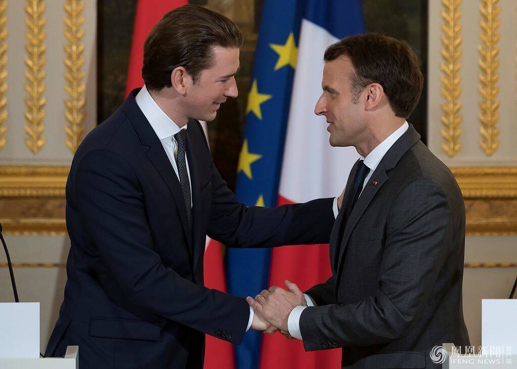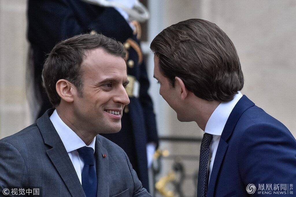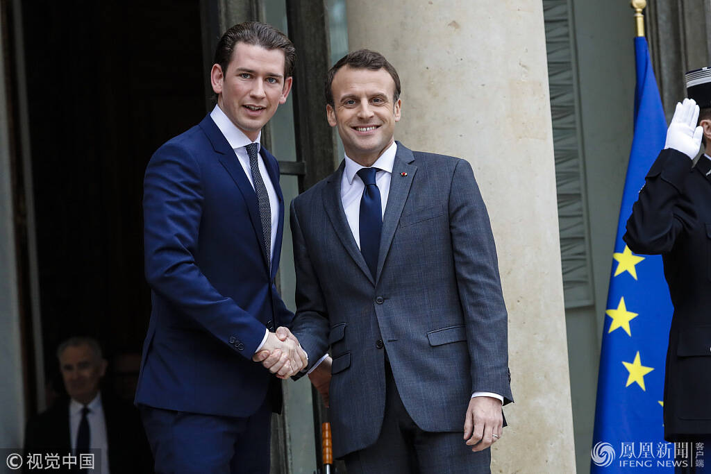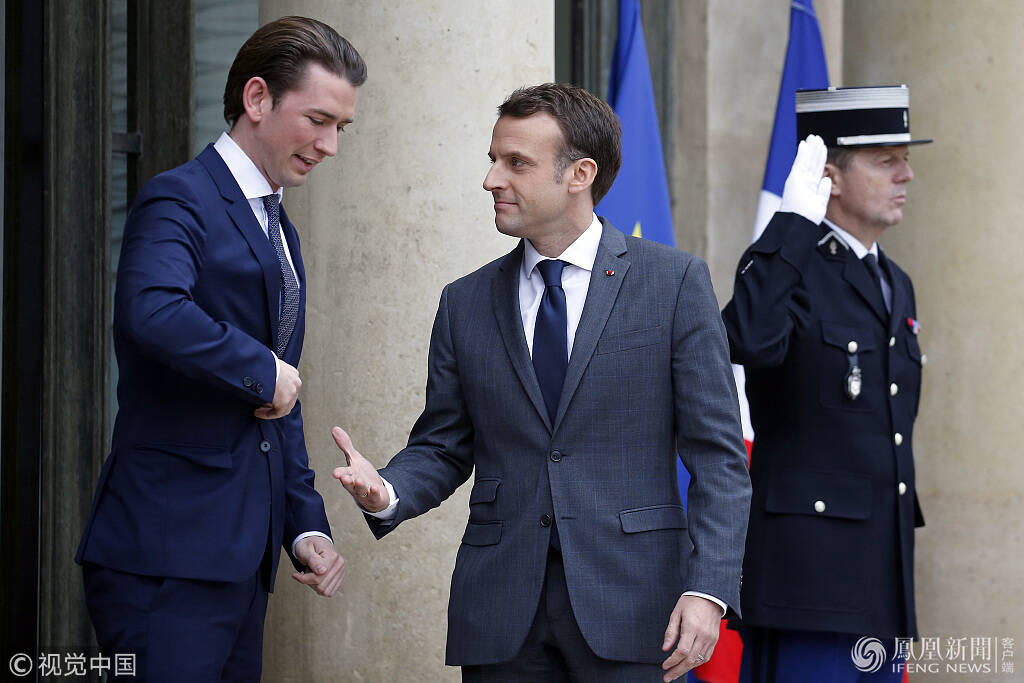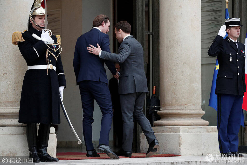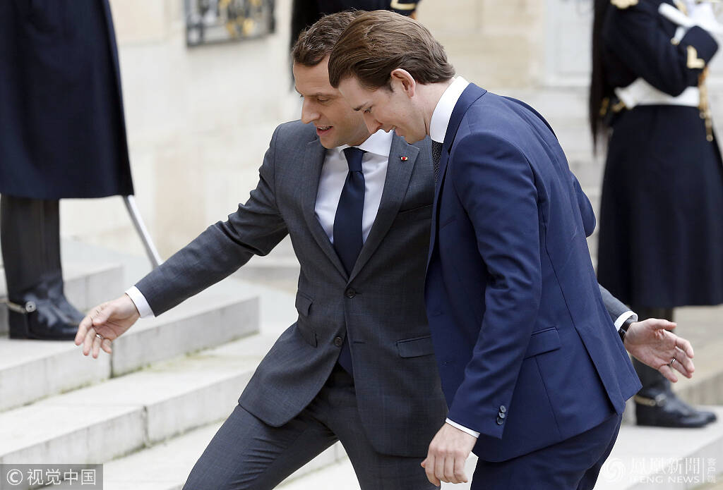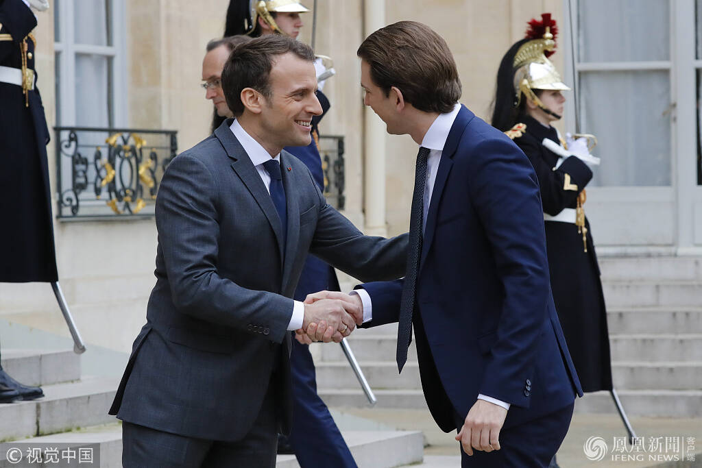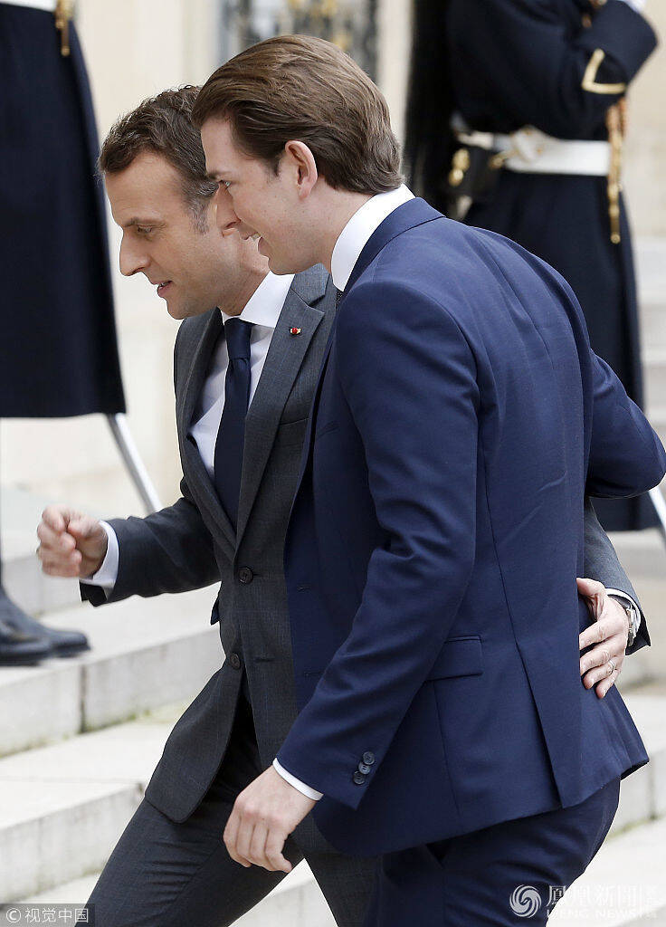 2018年1月12日,法国巴黎,法国总统马克龙会见到访的奥地利总理塞巴斯蒂安·库尔茨。图为库尔兹在整理西服,马克龙伸出手等待握手合影。视觉中国 图