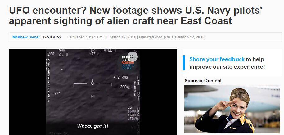 据ABC新闻网报道,已经有18年飞行经验的美国海军飞行员大卫·弗劳沃尔(David Fravor)向媒体爆料,他于2014年11月14日在加利福尼亚海岸进行常规飞行训练时,看到一个40英尺高的“无翼物体”,以惊人的速度飞行。“我不知道自己看到的是什么,但它令人震撼,一个没有翅膀的飞行物,却在高速飞行”。