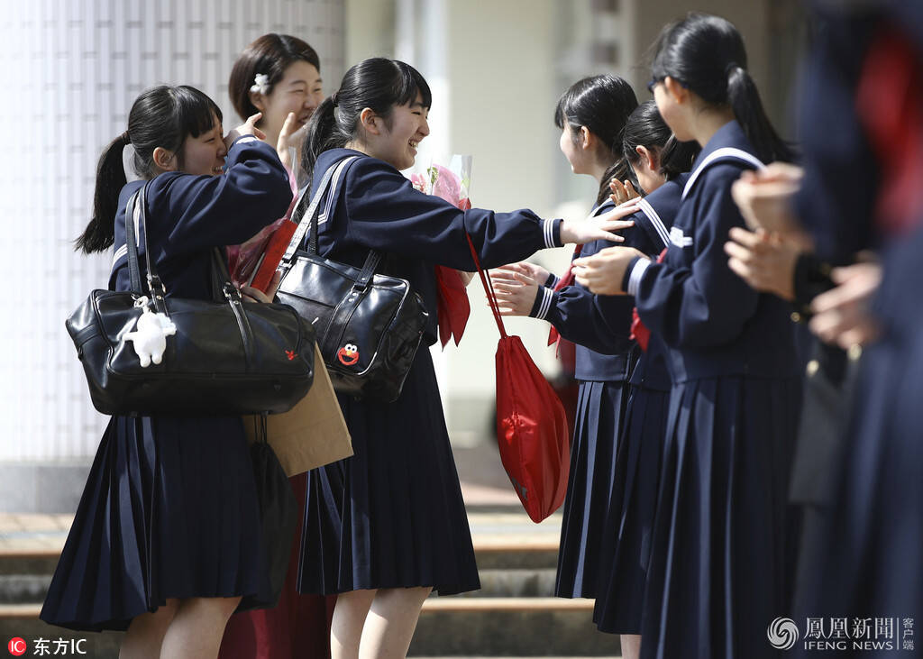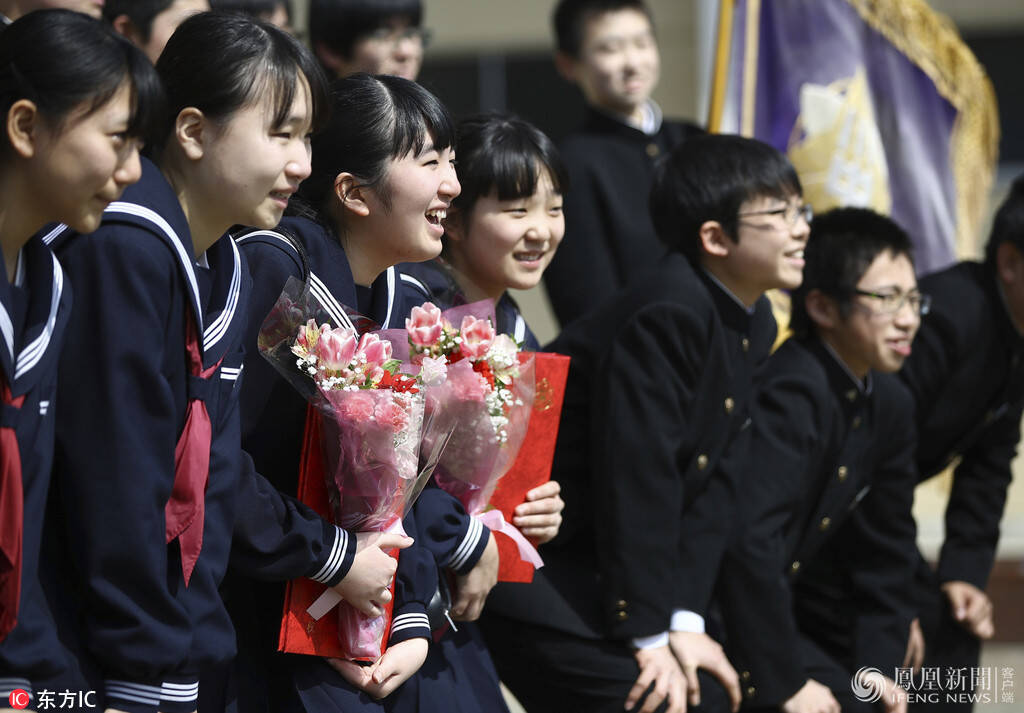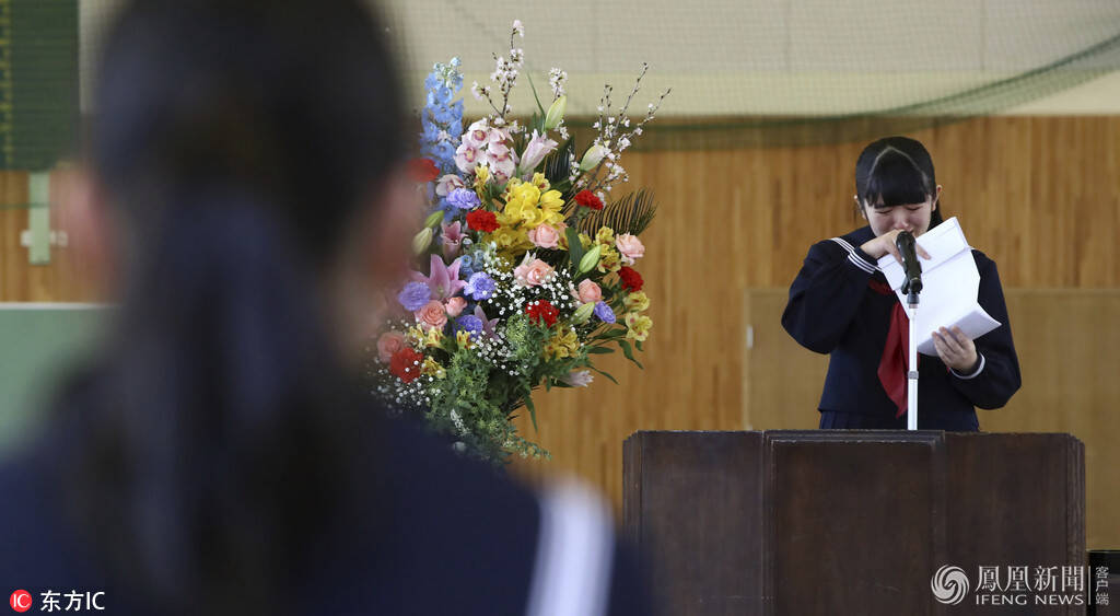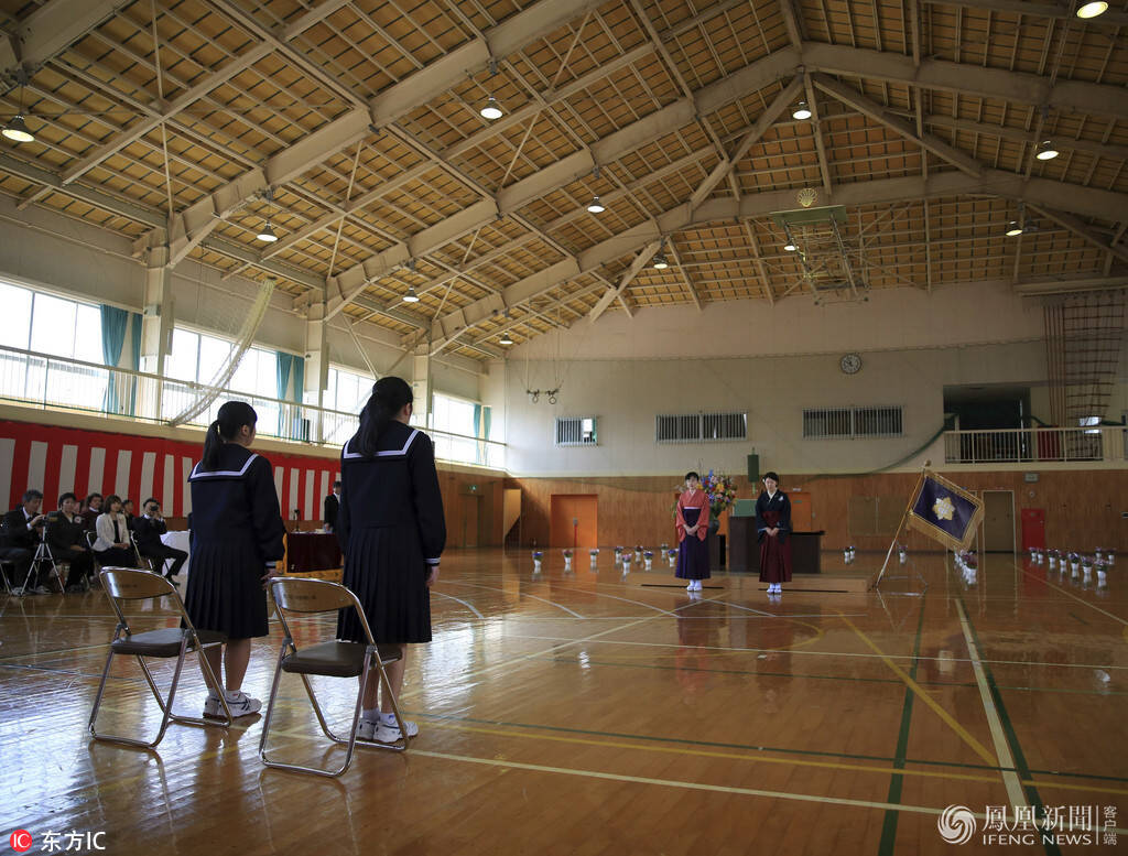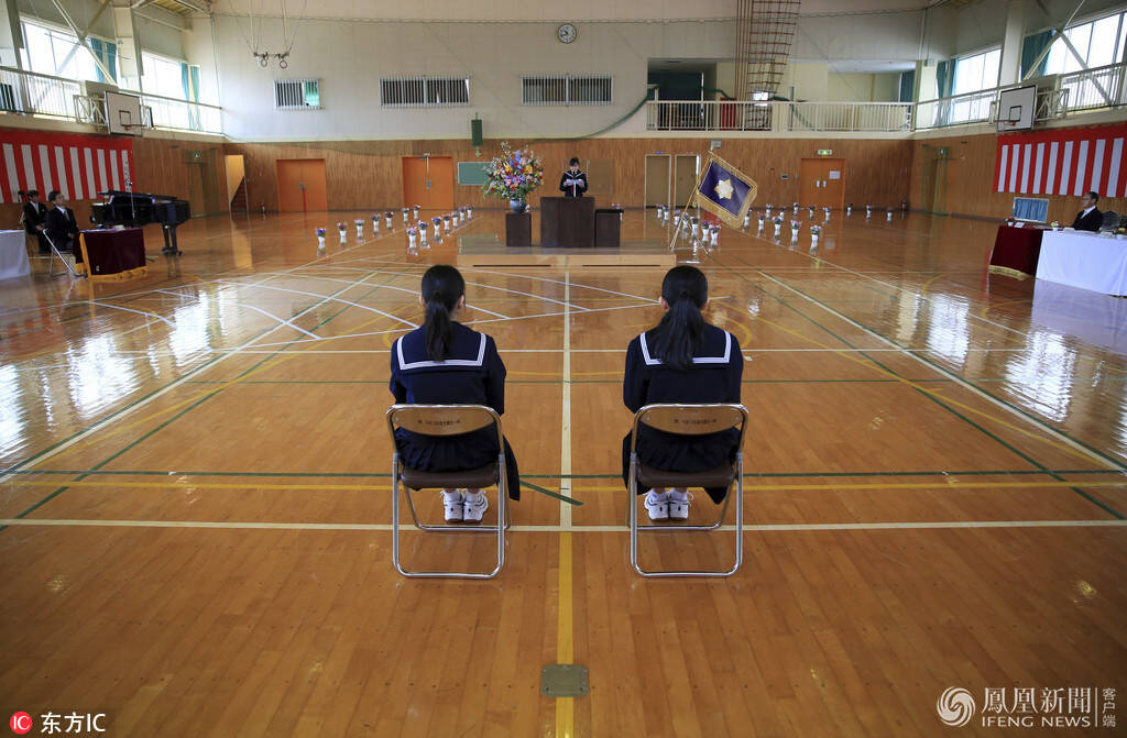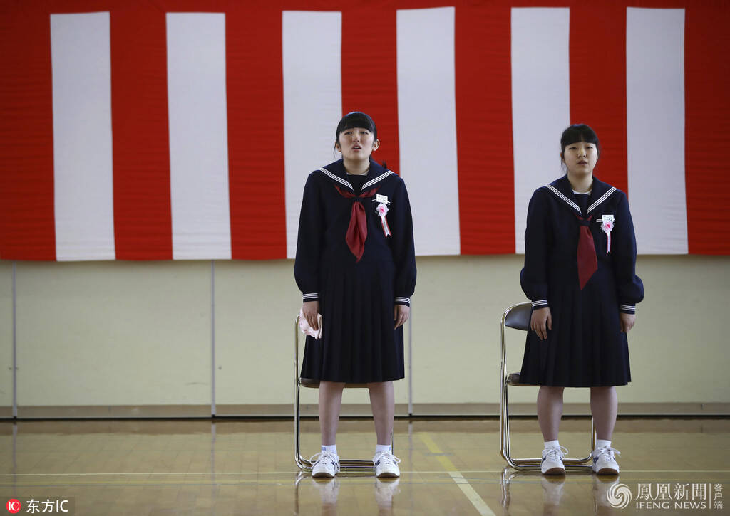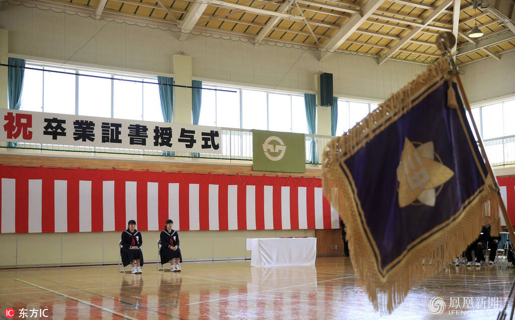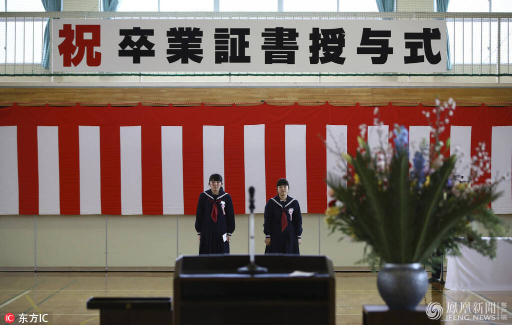 2018年3月13日,日本福岛,15岁的Chika Akimoto和Natsuki Endo参加川内村中学毕业典礼。2011年3月11日东日本大地震和福岛核泄漏事故发生后,川内村所有居民均已撤离。禁区封锁解除后,只有Akimoto和Endo回到学校。如今,两位小姑娘终于迎来了毕业的一刻。来源:东方IC