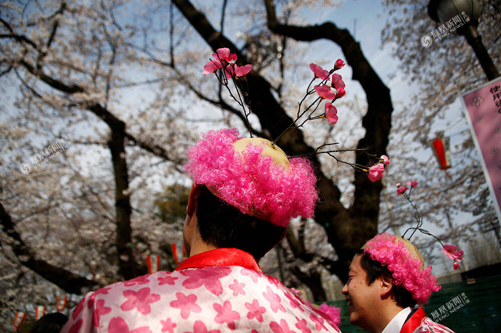 2017年4月5日,日本东京,人们戴着“樱花”假发在樱花树下野餐。Kim Kyung-Hoon/摄