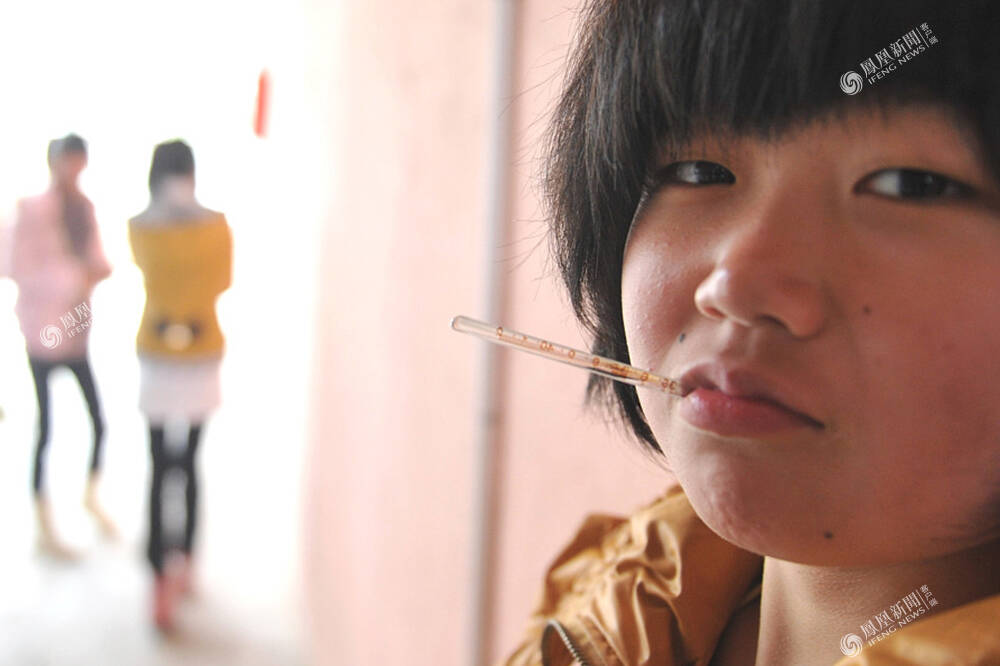 2012年2月15日,福建,天气忽冷忽热,浦城一学校70名学生得了流感,一名学生叼着体温计量体温。视觉中国/图