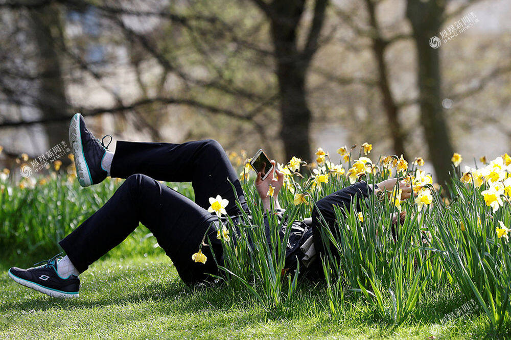 2017年3月31日,英国伦敦,一名游客躺在黄水仙花丛中自拍。PETER NICHOLLS/视觉中国