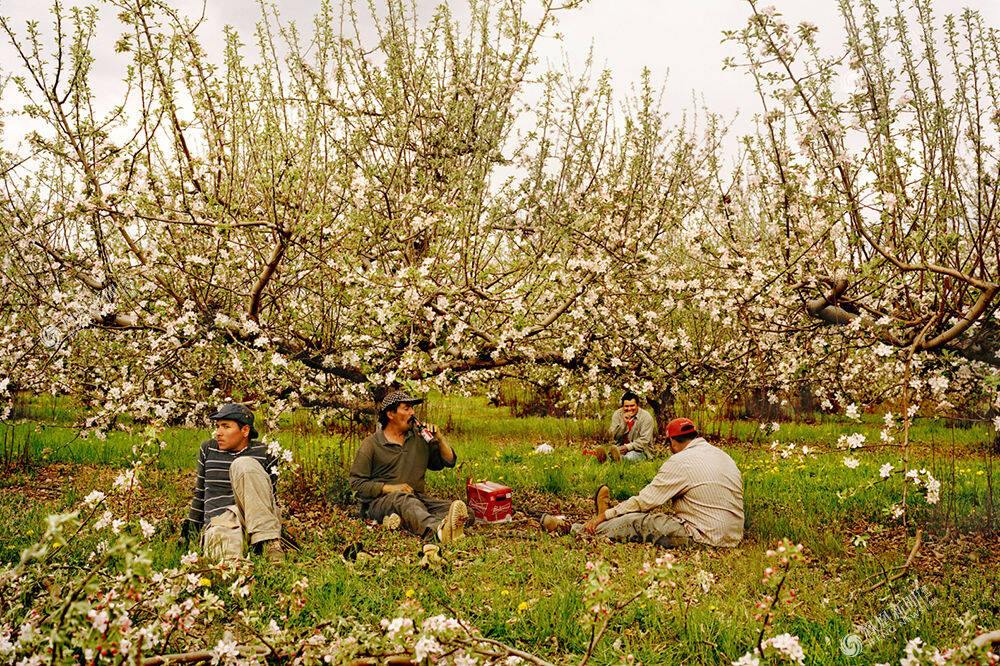 纽约,星期天下午,一群修剪苹果树的墨西哥打工者在吃午饭。