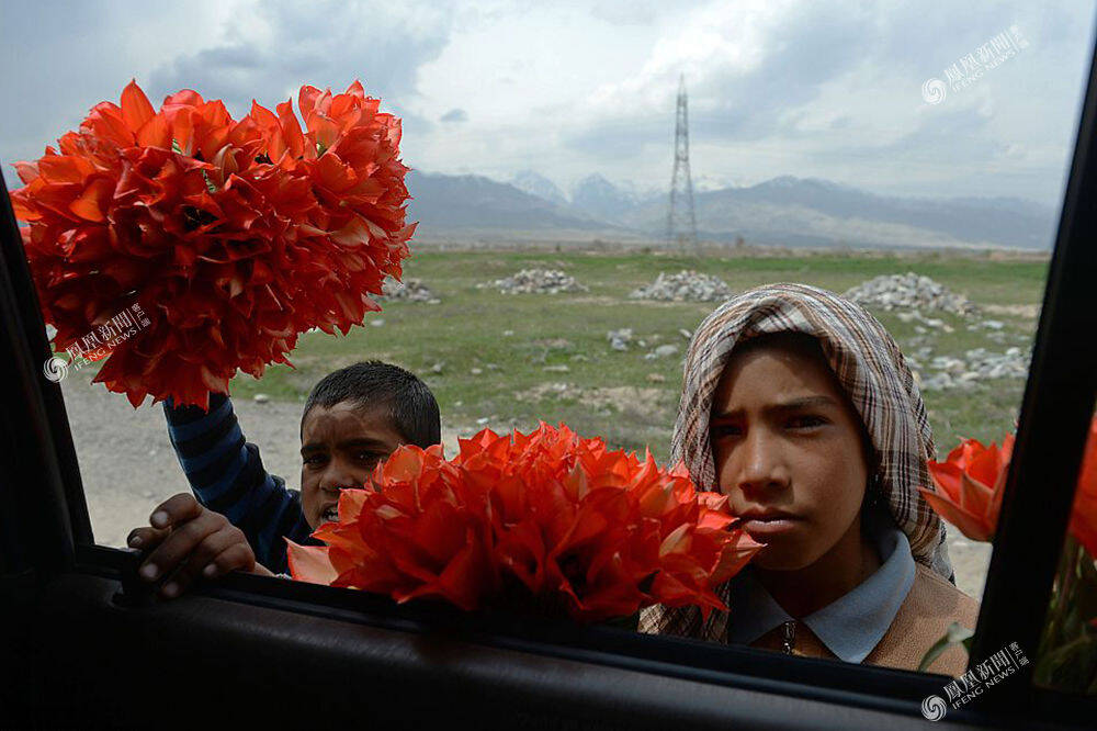 2014年4月15日,阿富汗,8岁的Malik和11岁的Popal在向路过的乘客卖野郁金香。卖野郁金香是贫穷阿富汗家庭春天时的重要收入来源。