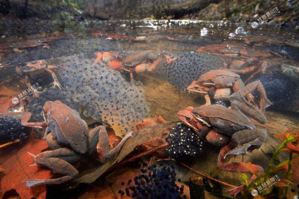 美国,青蛙在池塘里抱对产卵。