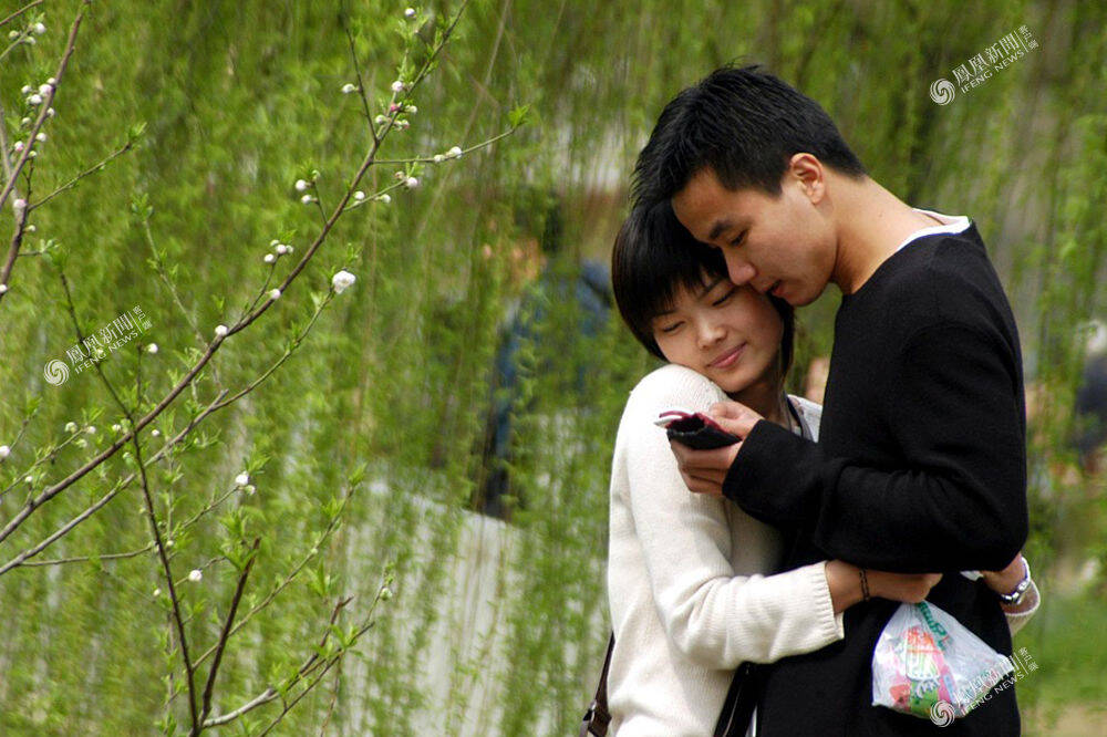 2005年4月3日,南京,情侣依偎在绿柳边。
