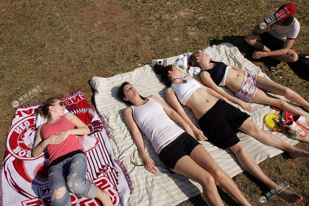 2006年3月31日,美国波士顿,气温升高到20℃,人们在公共娱乐场沐浴阳光享受春天的温暖。Joe Raedle/视觉中国