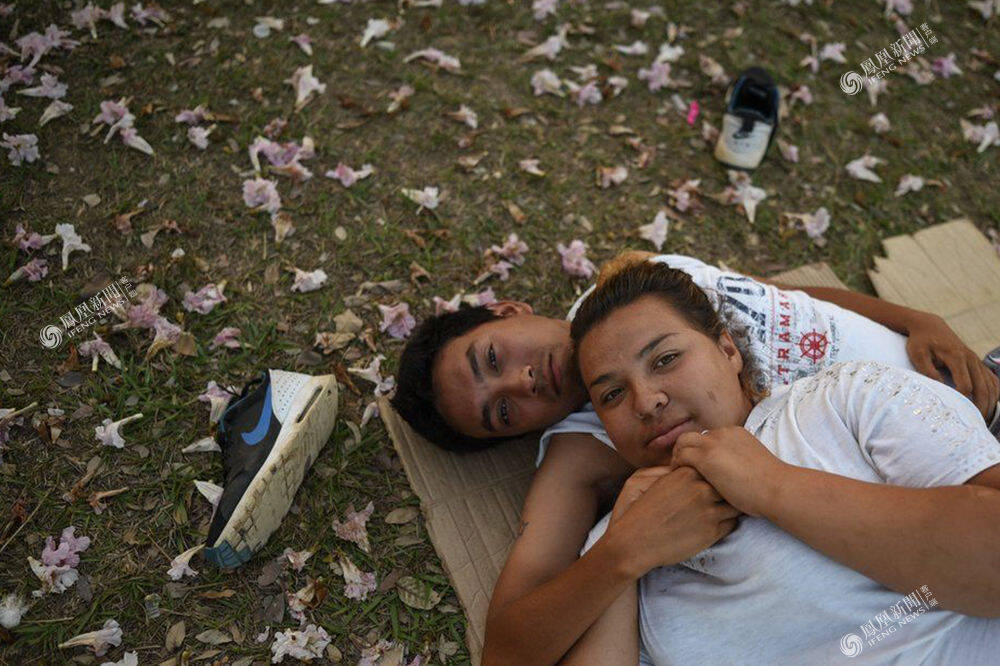 墨西哥瓦哈卡州,中美洲移民垫着硬纸壳躺在落花草地上。每年都有成百移民试图从这里穿过美国边境,这个春天也不例外。