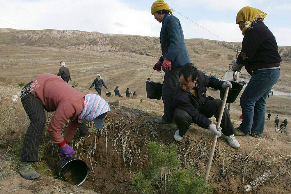 2007年4月6日,河北张家口,农民正在山坡上植树,以抵御春季风沙袭击。Guang Niu/视觉中国
